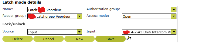 Wanneer de latch groep is aangemaakt dan stel je de Lock/Unlock in op de aangemaakte Input. Je zet dan de source op Input en selecteert dan de aangemaakt input waar de Unifi Door Controller op is aangemaakt.